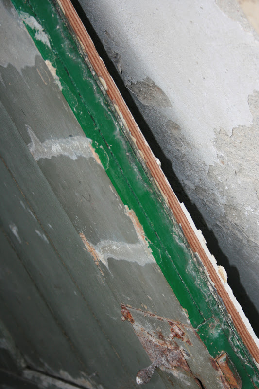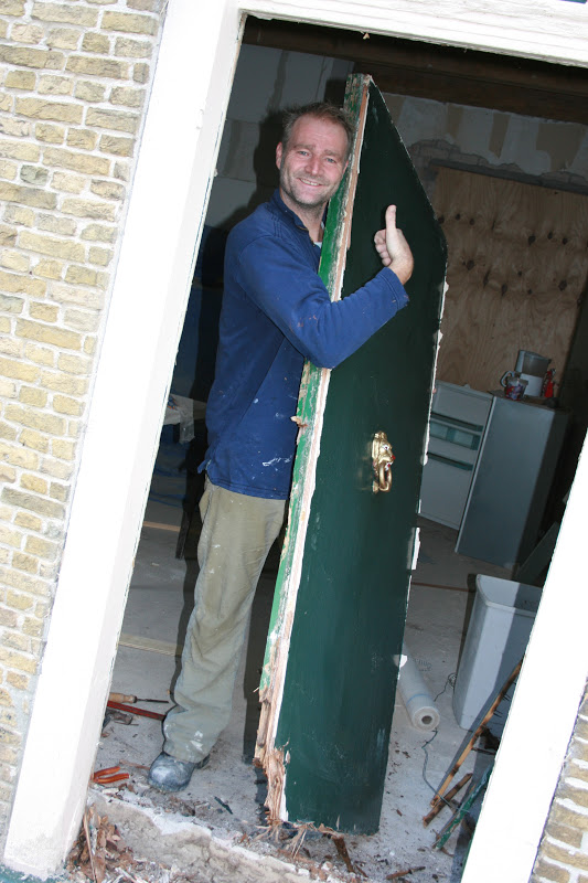 Aan de buitenkant zit een meranti multiplex plaat zo aan de verrotte onderkant van de deur te zien. Die moet er nog even af en dan kunnen we de oude voordeur helemaal natekenen en opmeten, zodat deze opnieuw gemaakt kant worden. En natuurlijk de oude originele sloten eraf! Ze leken in ieder geval erg op de sloten die we in het huis van Linschoten op landgoed zagen, dus dateren zeker van ergens voor 1890.