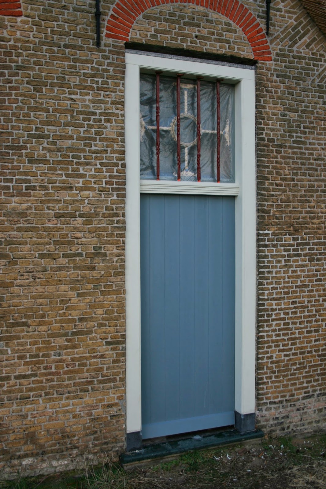 Terwijl Hans en ik gisteren aan het werk waren, heeft de aannemer een nieuwe echte voordeur met kozijn geplaatst. Het oude kozijn was gaan rotten via de authentieke spijlen. En de deur was betimmerd met een plaat en weggemetseld aan de binnenkant. Deze bleek ook helemaal aangevreten te zijn en bood tijdlang huis aan een mierennest!