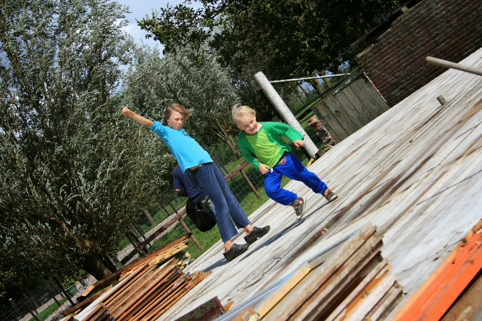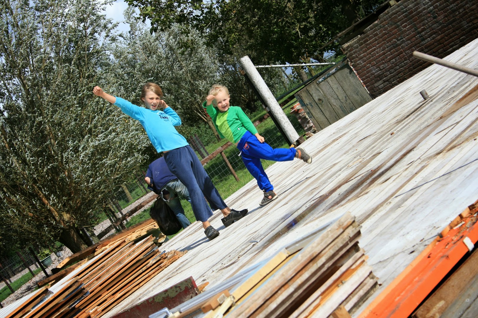 Ondanks of dankzij (?!) het stormachtige weer van afgelopen weekend is de keet nu echt down. Wat we over hebben is een hoop afvalhout en ramen en deuren. Er is er maar 1 raam gesneuveld bij het slopen omdat er een balk doorschoot. De rest hebben we heel weten te houden ondanks de harde wind.