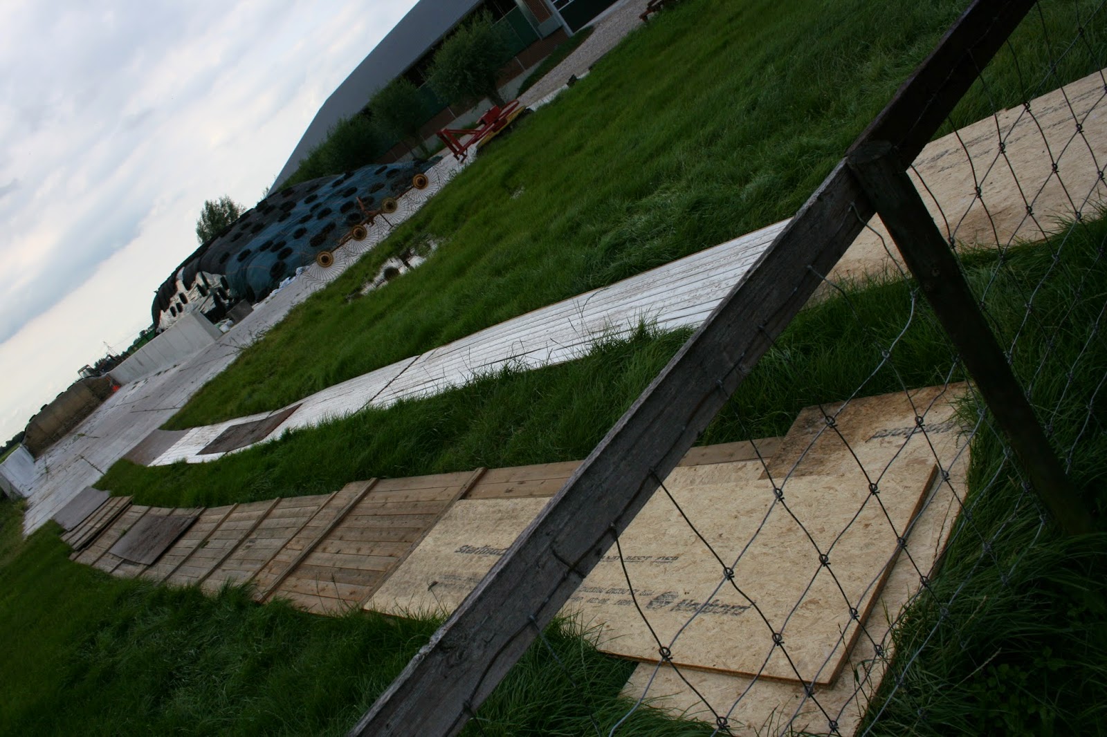 Voor het afvoeren van de afvalcontainer hebben we een heel pad aangelegd dor het weiland bij Kees van houten panelen en een paar stalen rijplaten. In de hoop dat de vrachtwagen die de container komt ophalen niet wegzakt in het drassige weiland…