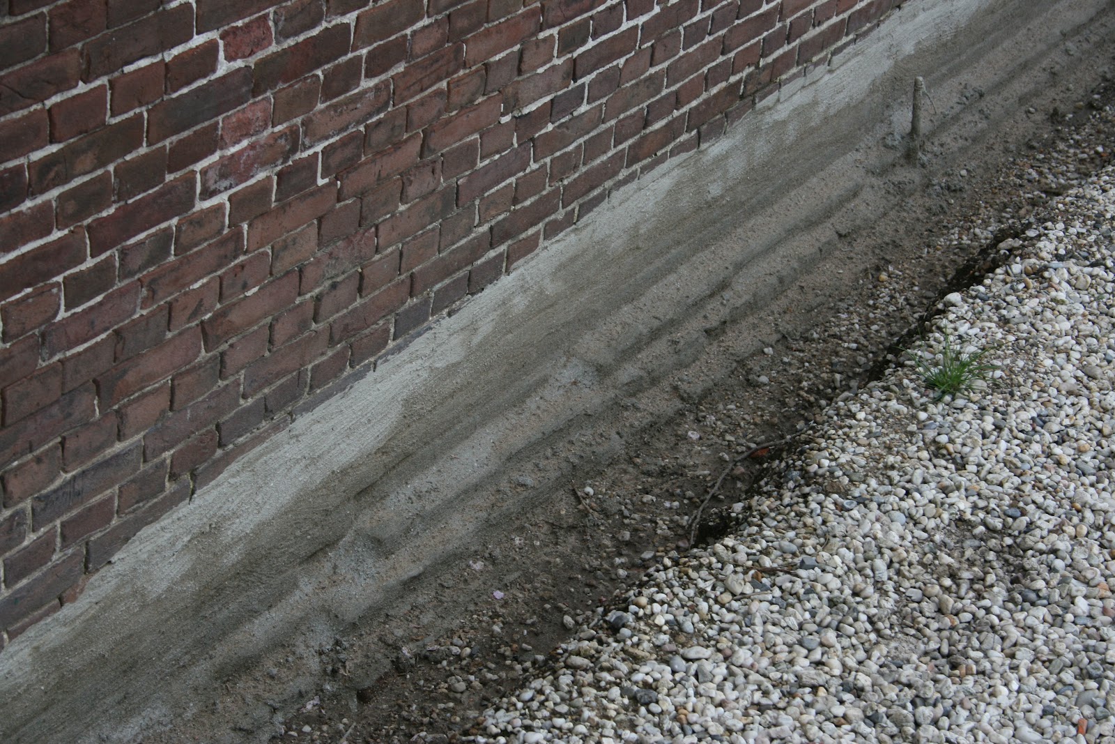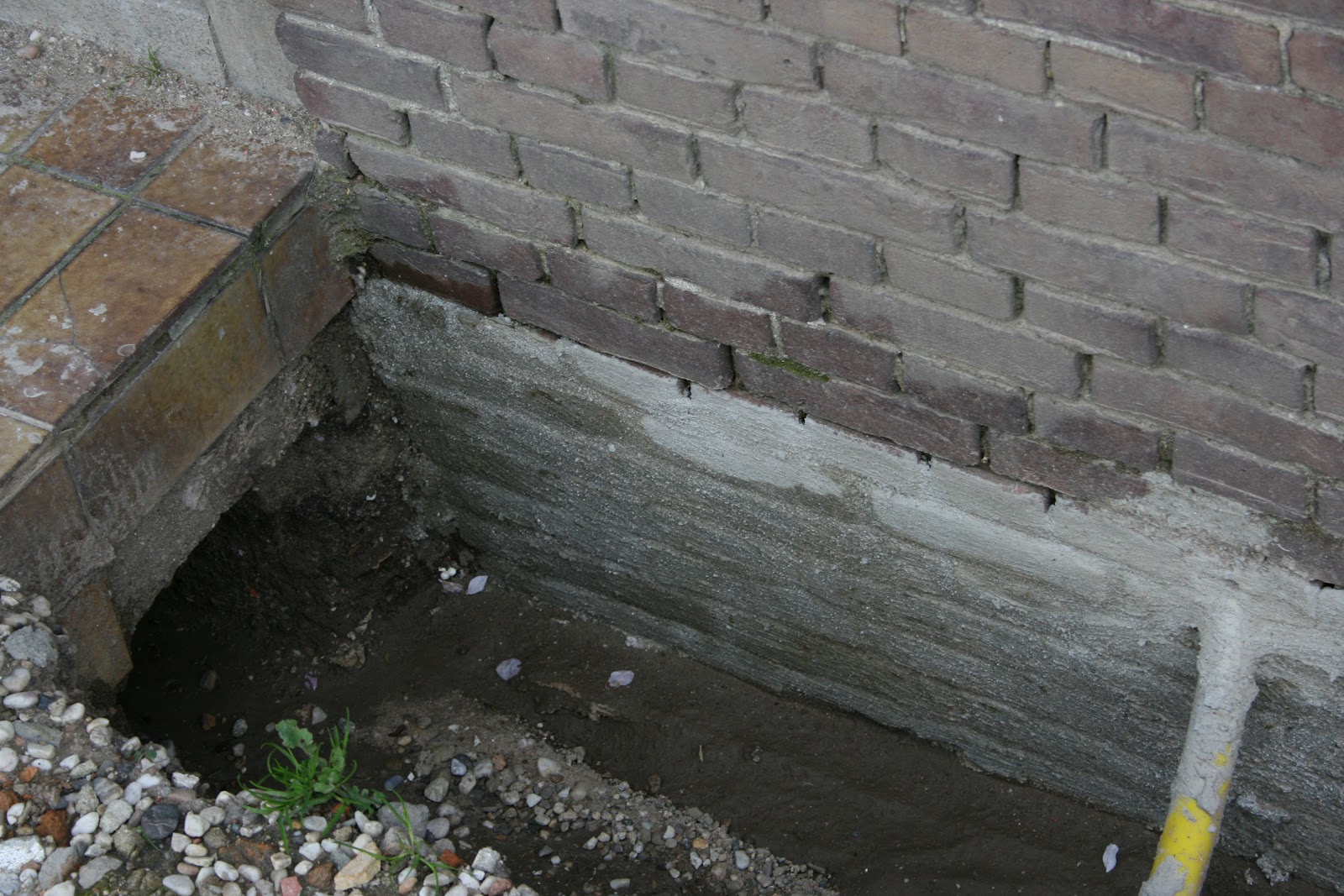 Het is niet alleen nog even verder uitgraven van de al gegraven geul met gravertje. Af en toe moet er ook nog wel wat gerepareerd worden onder het maaiveld. En om het een beetje dichter te krijgen wordt de muur onder het maaiveld met een laag metselcement met waterslag ingesmeerd. Dat gaat een stuk sneller als alles voegen en helpt waarschijnlijk beter tegen het binnendringen van vocht via de oude muren.