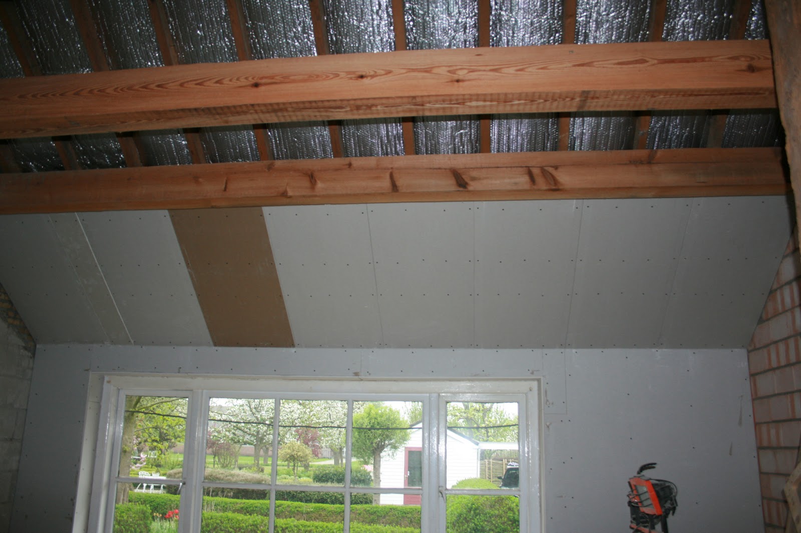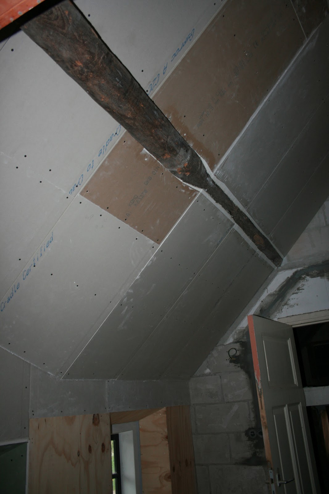 In het voorhuis zijn op de badkamer na de schuine plafonds voorzien van gipsplaat. Het ziet er gelijk een stuk meer af uit, ook al zal het grootste effect zijn als de stucadoor is geweest. Dat moet alleen nog even wachten tot de vloeren gestort zijn en alles dicht is – ook de badkamer en hal.