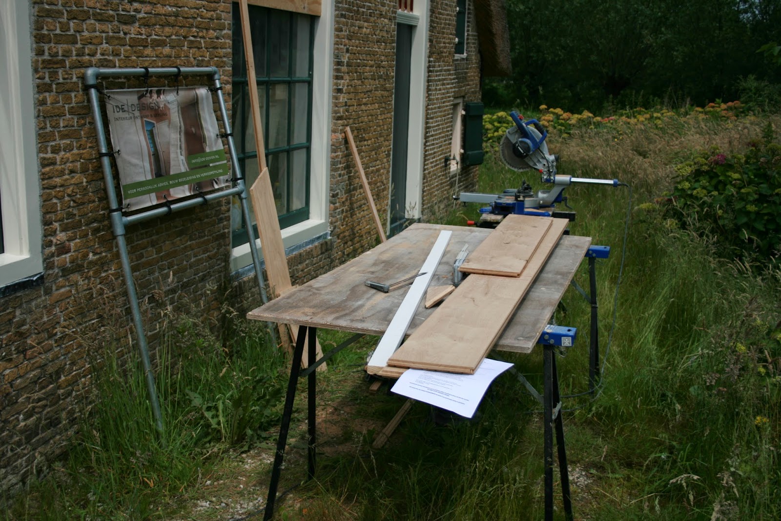 De eiken vloerdelen heb ik zaterdag opgehaald. Ondertussen zijn de Hans en pa bezig geweest met de laatste voorbereidingen om de vloer te kunnen leggen.