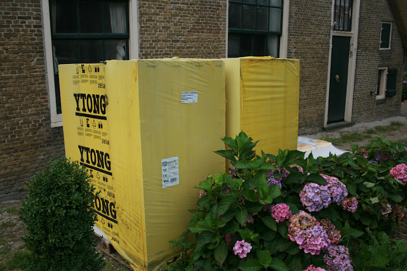 De vorige stapel stenen om binnenmuur op te bouwen zijn nog niet eens verwerkt, of er staat weer een stapel cellenbeton klaar.