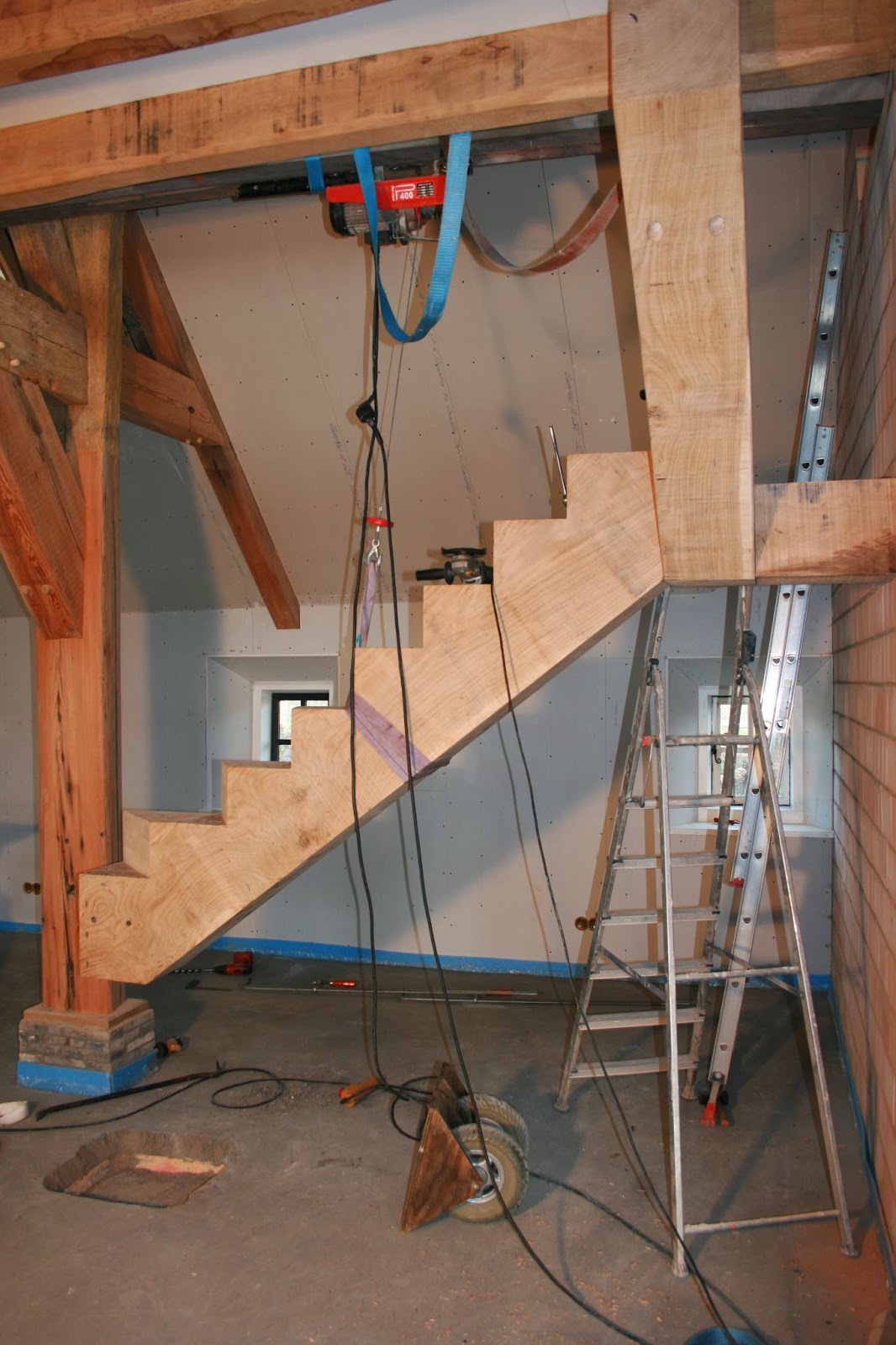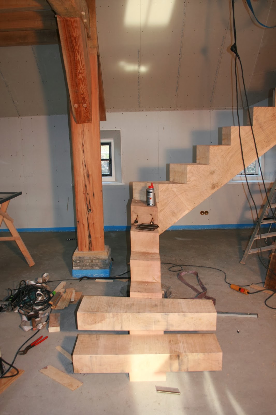 De eerste zes treden liggen erop en de lijm moet drogen. De massieve voet staat vast in de gietmortel. De eiken onderdelen zijn in een dag onroerend goed geworden! Het heeft wel wat creativiteit van Peter en Adrie gevraagd. Met name om grootste en zwaarste deel van de trapboom van de aanhanger af te krijgen, met een mannetje in de boerderij te rijden en met een takeltje de lucht in te hijsen!