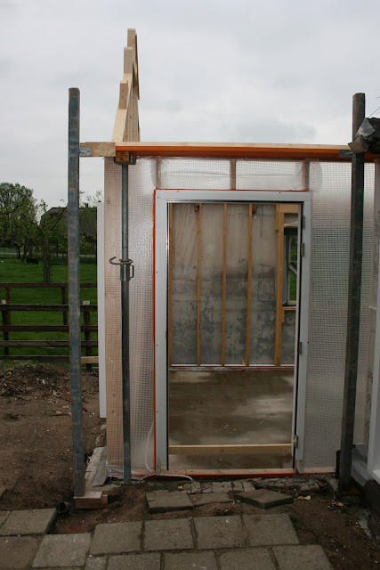 De kaasmakerij ligt er nog open en bloot bij. De kozijnen zijn – op het raam boven in de gevel na – geplaatst, maar het dak zit er nog niet op. Het eiken makelaars spant wordt komende week gemaakt. Het zal pas geplaatst worden als al het materiaal om het dak dicht te maken ook op de bouwplaats aanwezig is …