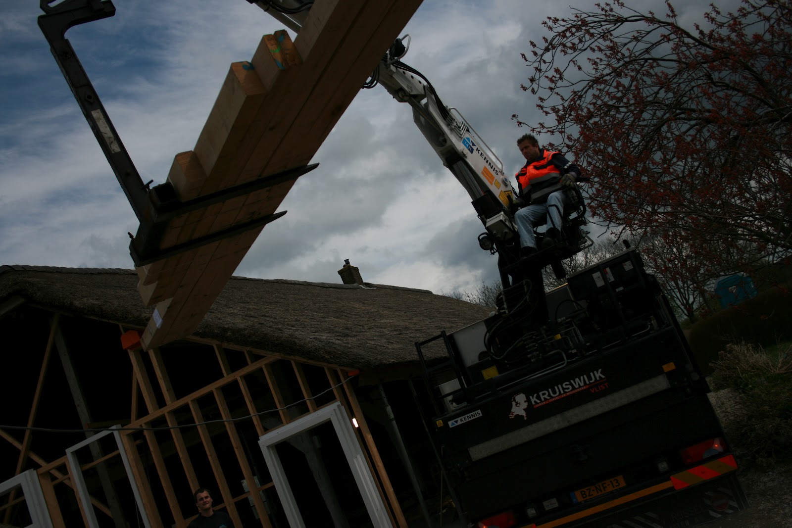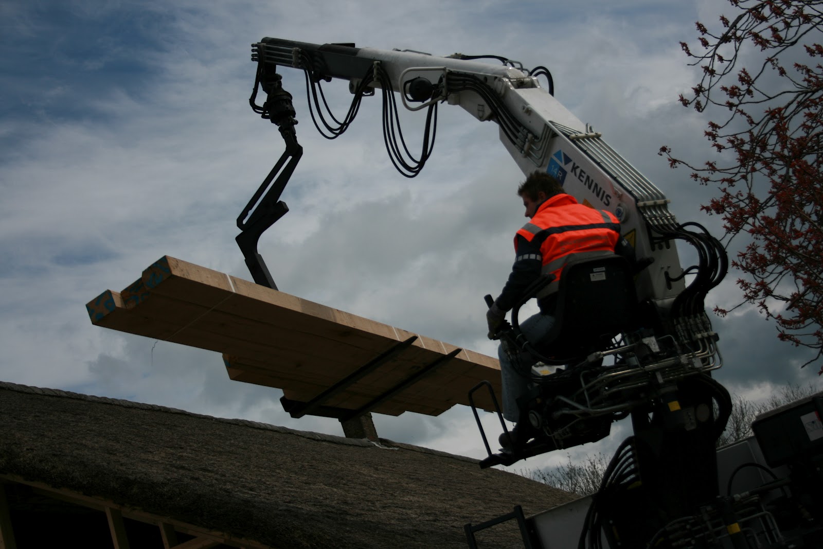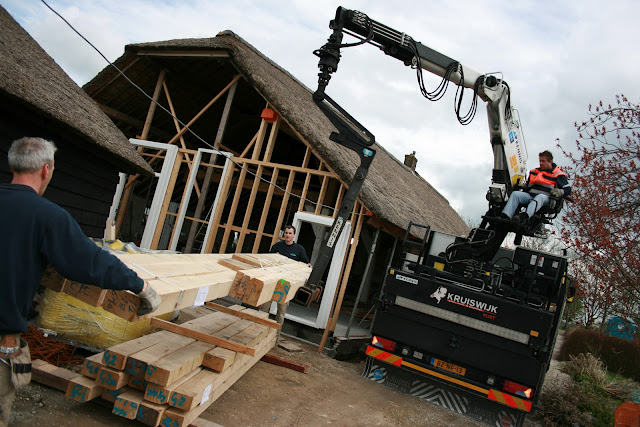 De transporteur van Van Neerbos is een kunstenaar met de kraan achterop de wagen. Zonder problemen hevelt hij de balken waarvan de langste 6.10 meter zijn over het rietendak van de boerderij en de hooiberg en omzeilt ook de elektriciteitsdraad nog die daar gespannen is voor onze elektriciteits voorziening in de woonkeet.