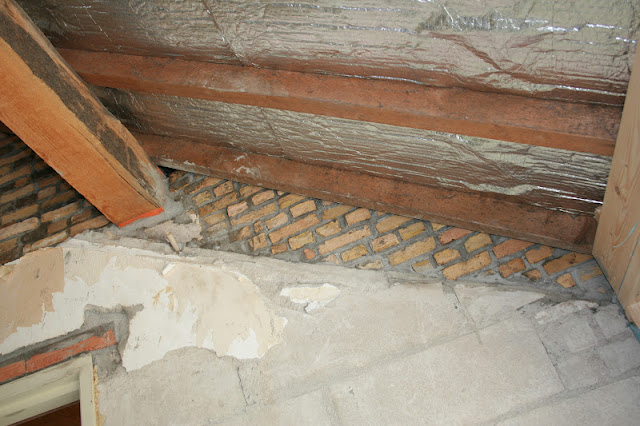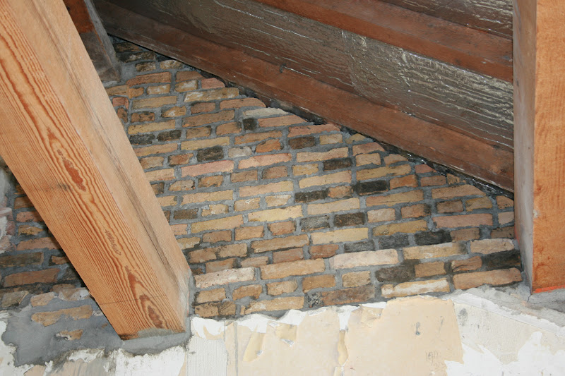 Bij het vervangen van het oude rieten dak, bleek plots dat de brandmuur bij een tweetal dragende balken niet echt meer goed ondersteunde maar op het punt stond om eruit te klappen. tijdelijk is dat even verholpen door Nees door de dragende balken te ondersteunen met een paar ‘stempels’ van sloopbalken die er nog lagen.