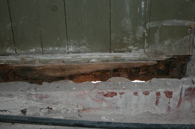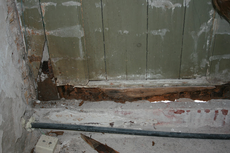 We worden getriggerd door de dorpel die los gaat zitten van de multiplex plaat. Blijkt erachter een hoop houtrot te zitten en een flink mierennest… Pas als we de muur van cellenbeton slopen zien we niet alleen de schade aan het hout maar treffen we ook een oude deur met oud hang- en sluitwerk aan.