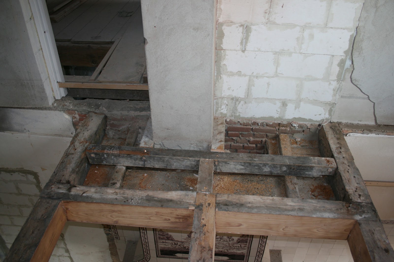 Bij de schouw moet in het houten plafond nog wel wat gerepareerd worden. Eerder heeft men daar wel wat balkjes geplaatst ter ondersteuning, maar echt vast zit het niet!
