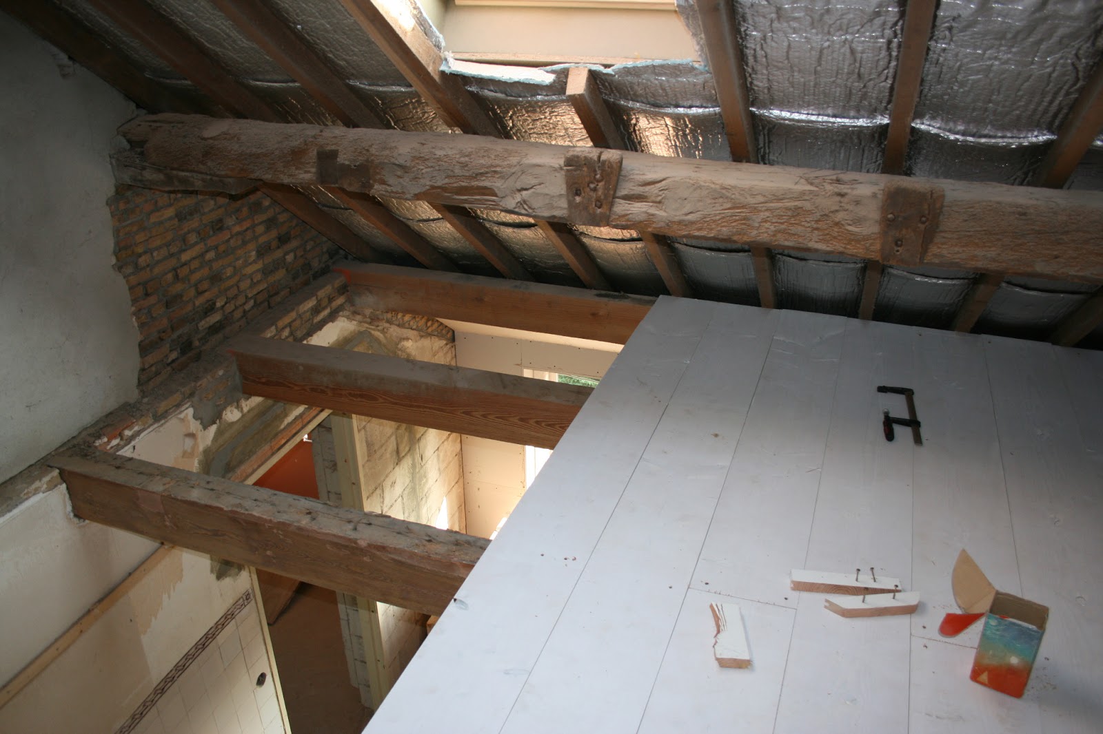 De oude plankenvloer boven de keuken zit er voor belangrijk deel al in.