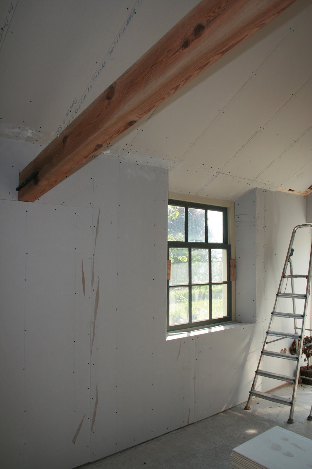 Na een dagdeel samen klussen waarbij Jesse het oke vond dat mama papa even ging helpen, hebben we de grote schuine wand op de deel bijna volledig met gipsplaat dicht zitten. Dat gaat best rap met complete platen en beiden gewapend met een boormachine om te schroeven. Hans op de steiger en ik op de trap om weer een plaat tegen de schuine wand te tillen en schroeven maar. Na een dagdeeltje zaten de grote platen erin, kon ik boodschappen gaan doen met Jesse, en heeft Hans al kleine rotstukjes op maat gezaagd, om het dakraam heen afgewerkt enz.