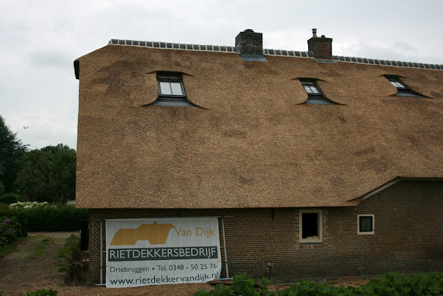 Oplet punt wordt wel de hoek bij de oprit. De overkapping van het dak is een fors stuk breder als deze was. Eerder was alleen het dakje boven de voordeur dat uitstak en vroeg om oplettendheid van vrachtwagenchauffeurs. Nu steekt de hele rietenkap maar met name op de hoek voor op de oprit is het rietendak kwetsbaar. Vrachtwagens kunnen nu niet zonder meer het erf oprijden.