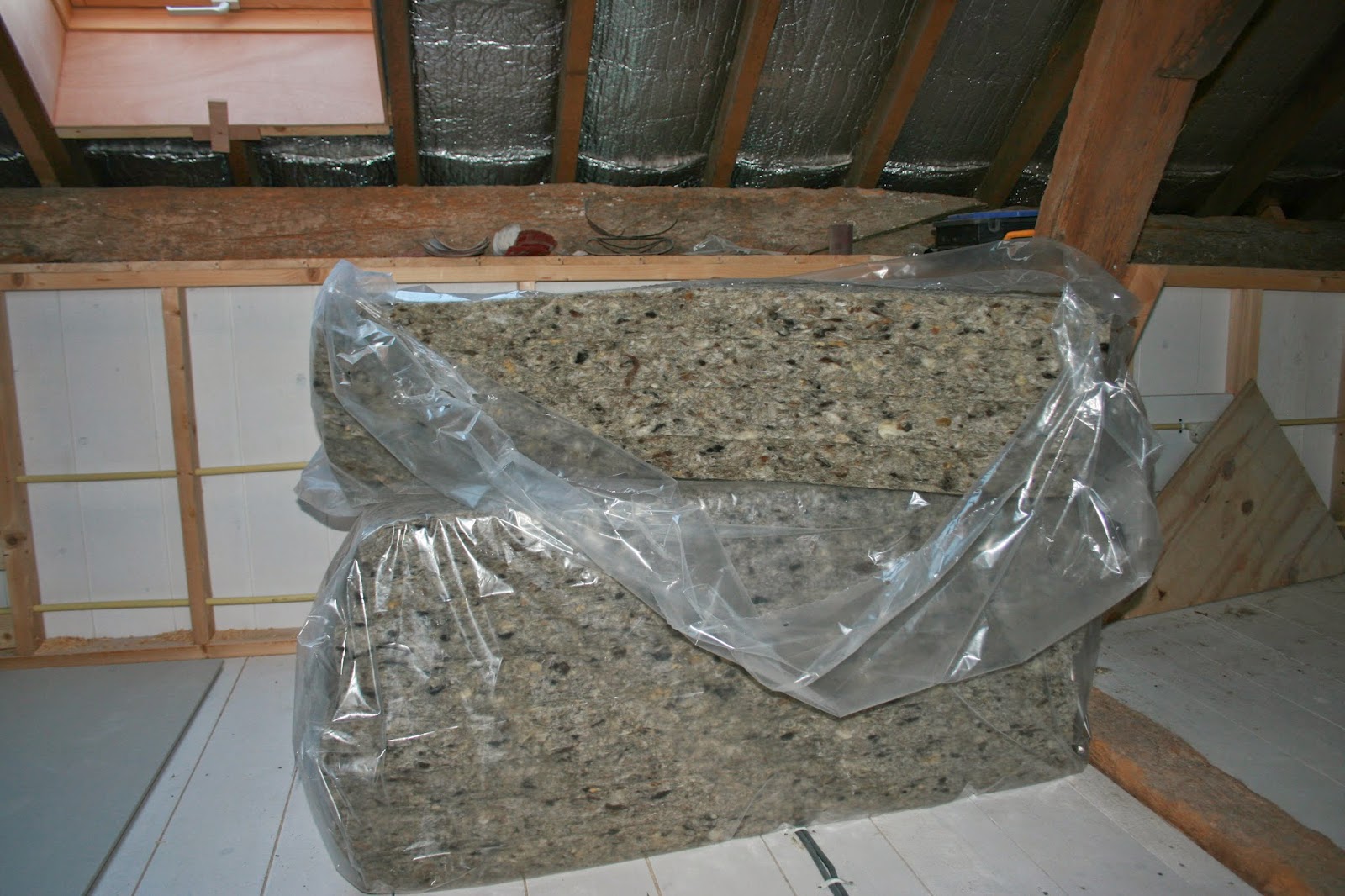 Eindelijk het geliefde schapenwol van blackmountain gebruikt in de binnenwanden. Het werkt niet alleen isolerend maar ook voor tegengaan van geluid prima. Ecologisch hergebruik van natuurprodukt noem ik dat.