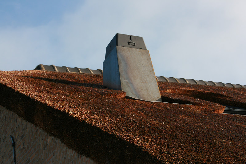 Het is nu niet meer zo’n blikken glimmende pijp in foute verhouding met grote vierkante zwarte ventilator erop… Totaalplaatje is nu helemaal goed. Alleen de oude schoorsteen valt nog meer uit de toon. Dat is nog iets om te verbeteren over paar jaar.