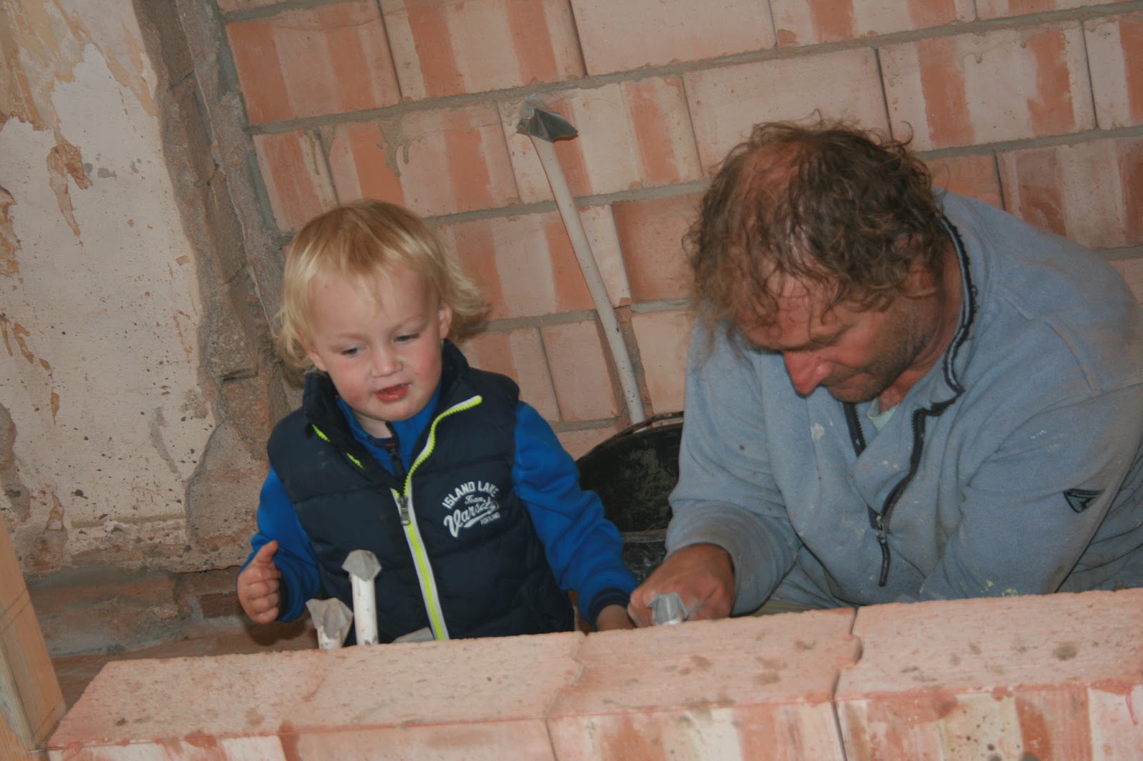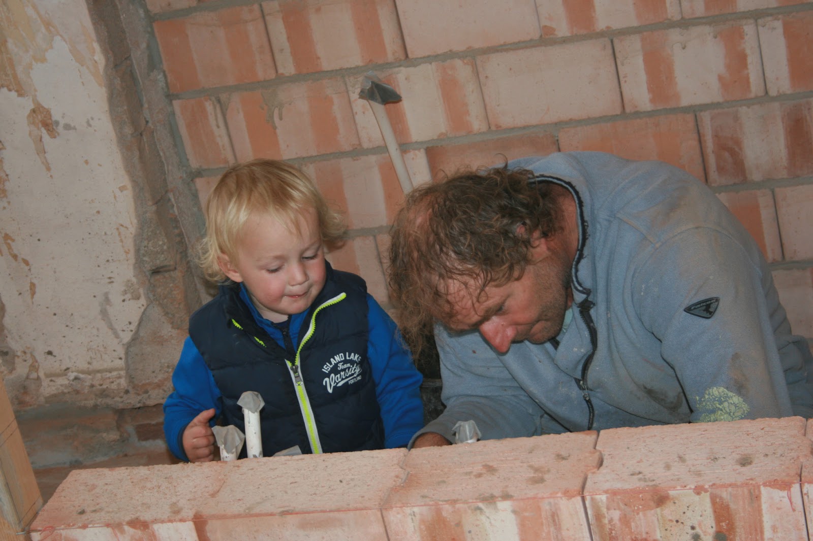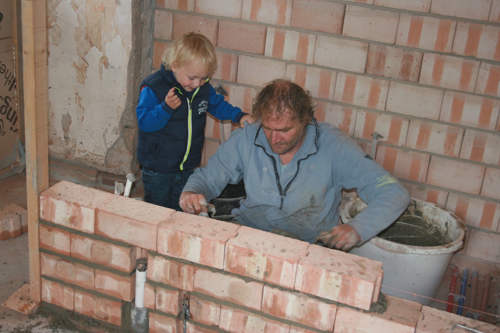 Hans is vandaag gestart met de opbouw van het afscheidingsmuurtje bij de douche waar de wastafels straks tegenaan zullen komen. Jesse komt even gezellig bij papa staan kletsen. Het liefst zou hij lekker meehelpen.