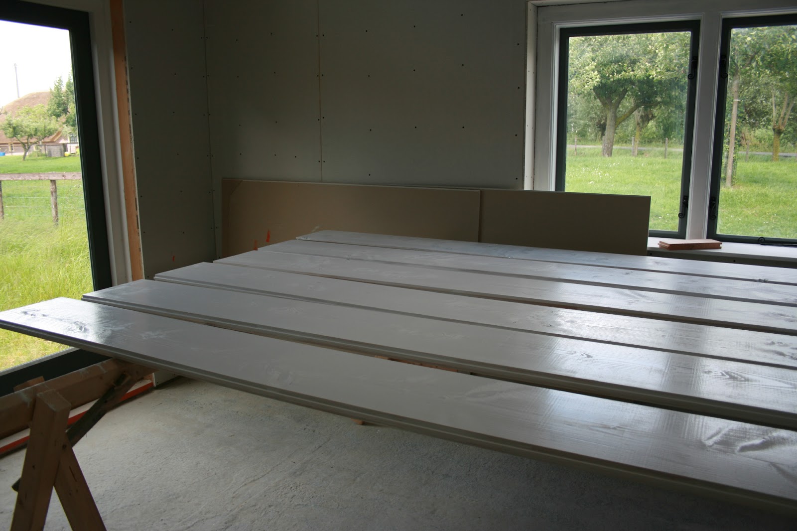 De eerste 45 m2 van in totaal 117 m2 aan douglas vloerdelen voor boven de keuken is geverfd. Vanavond nog 6 m2 in de lak en de eerste 17 planken zijn gereed. Nog 22 planken te gaan. Inmiddels hebben we de constructie verplaatst van de deel naar de kaasmakerij en kunnen er precies 6 planken tegelijk worden geverfd. Elke avond een uurtje verven om een kant te doen en met 3 dagen is er weer een serie gereed; helemaal in de grondverf en 1 kant afgelakt.