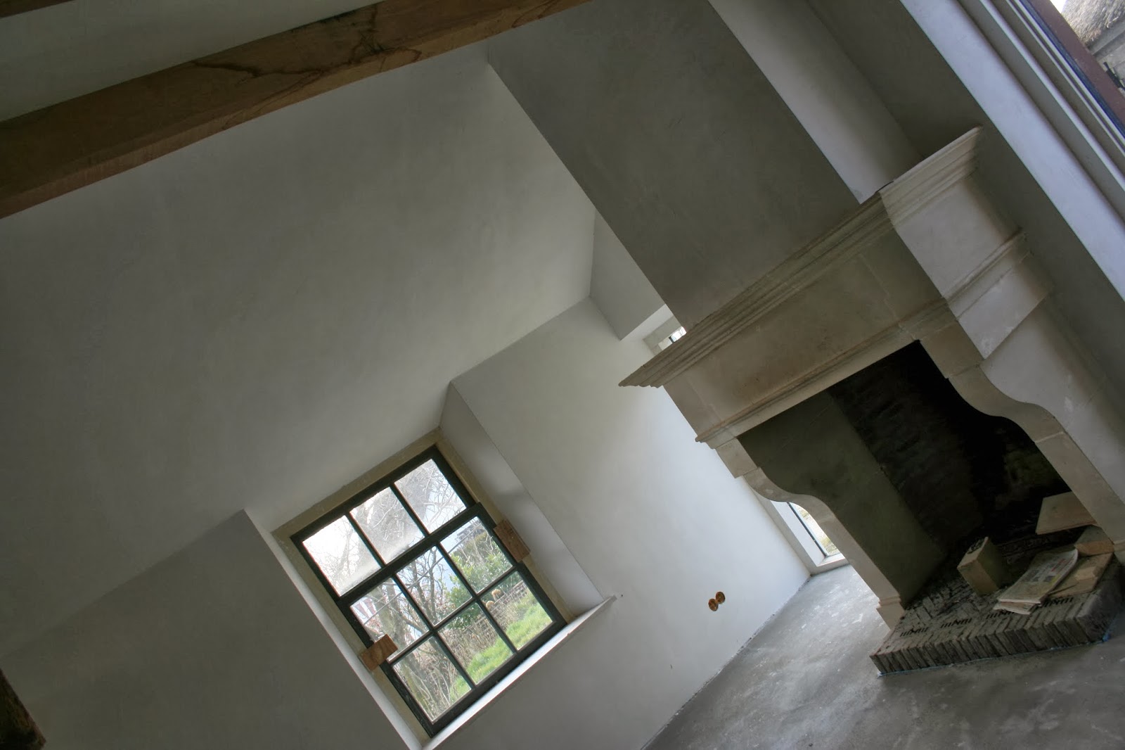 De stukadoor heeft binnen 2 weken de hele beneden verdieping gestukt.Het ziet er strak uit! Het moet alleen nog ‘een beetje’ drogen!